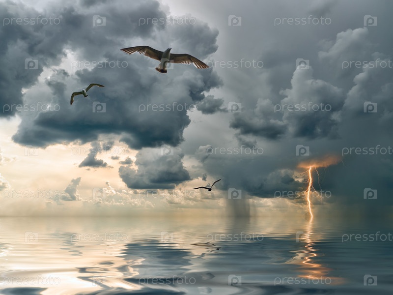 Чайки над океаном, приближение грозы