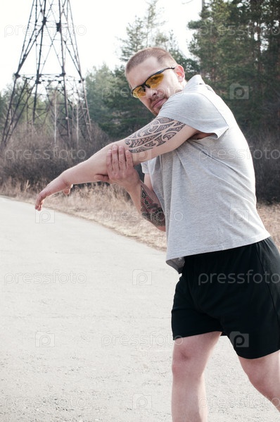 Мужчина разминается перед пробежкой на открытом воздухе