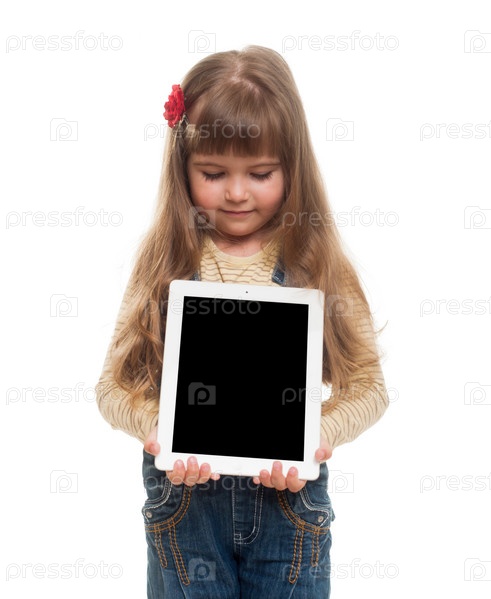 Маленькая девочка с планшетным компьютером в руках на белом фоне