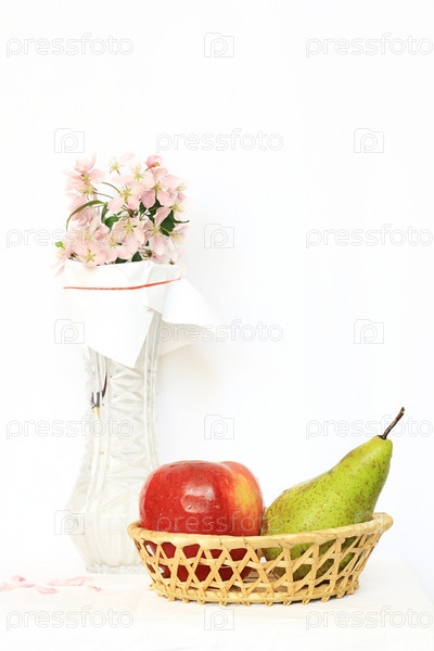 Корзина с яблоком, грушей и ваза с цветком