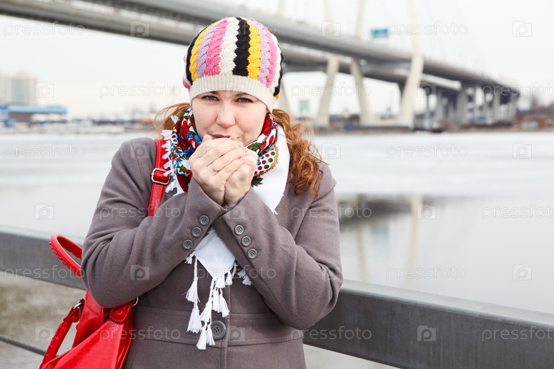 Портрет замерзшей женщины на набережной