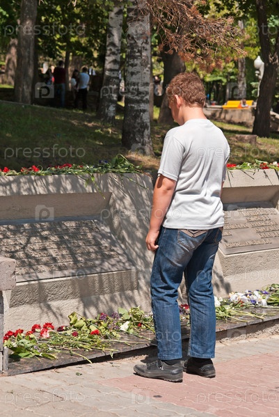 Подросток читает надпись на братской могиле