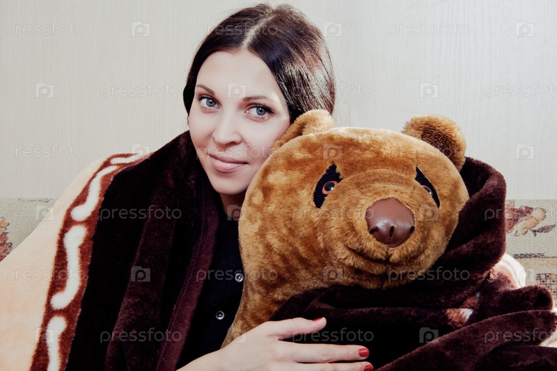 Молодая женщина под одеялом с плюшевым медведем