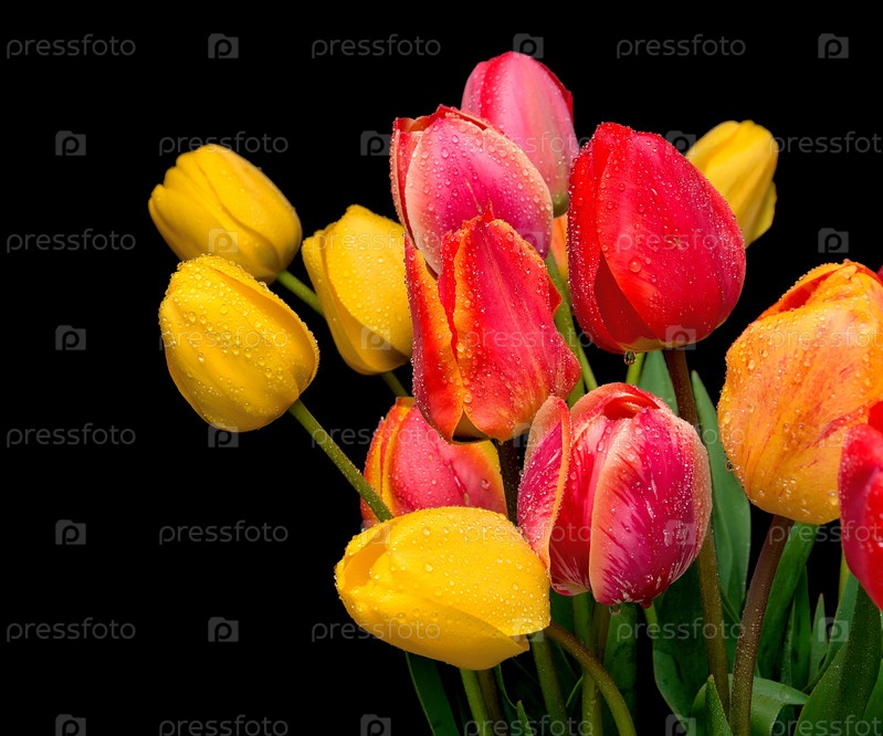 Букет из тюльпанов различных цветов с каплями воды на черном