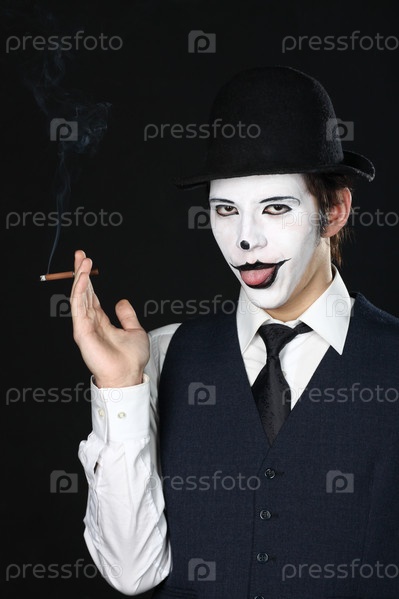 Мим в гриме с сигарой на черном фоне