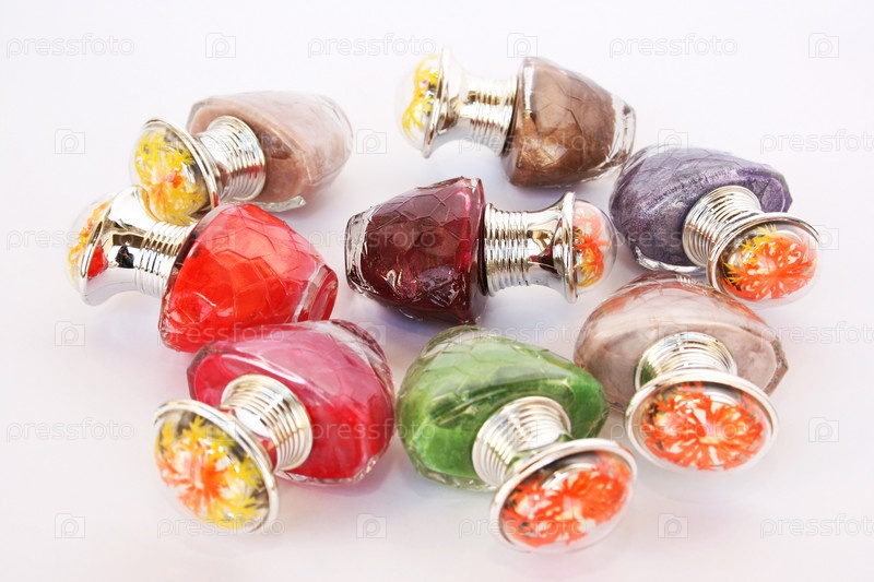 Флаконы с лаком для ногтей на сером фоне