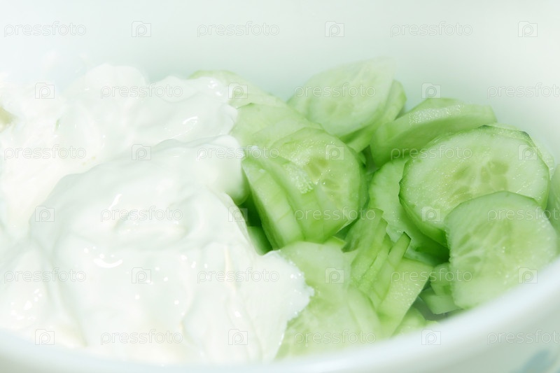 Нарезанный огурец со сметаной в салатнице