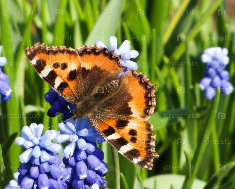 Коричневая бабочка на голубом цветке мускари