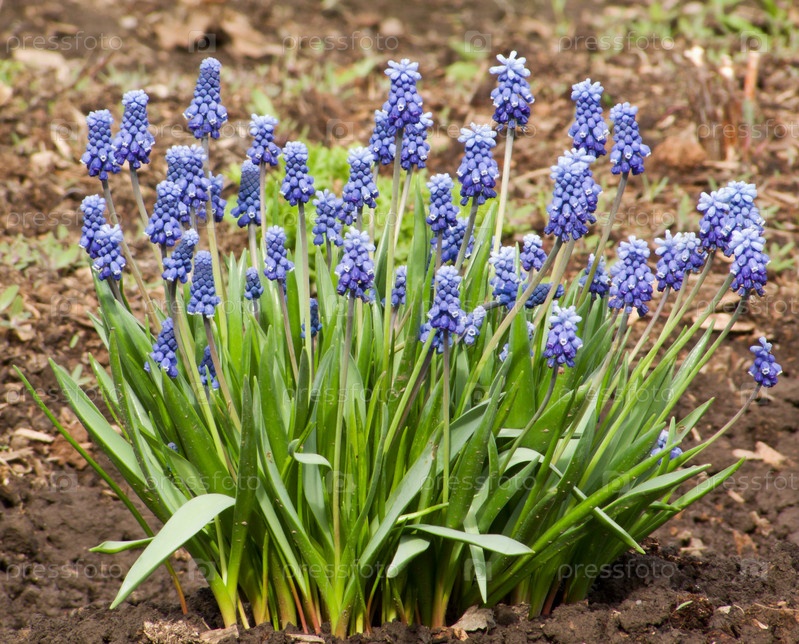 Голубые цветы мускари на клумбе