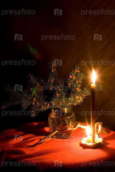 Натюрморт с горящей свечой и веткой ели