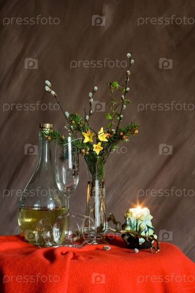 Натюрморт с вином, горящей свечой и букетом из веток ели и вербы