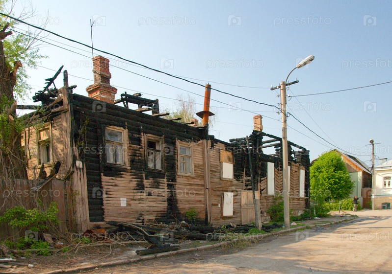 Обгоревший деревянный дом на одной из улиц в Рязани