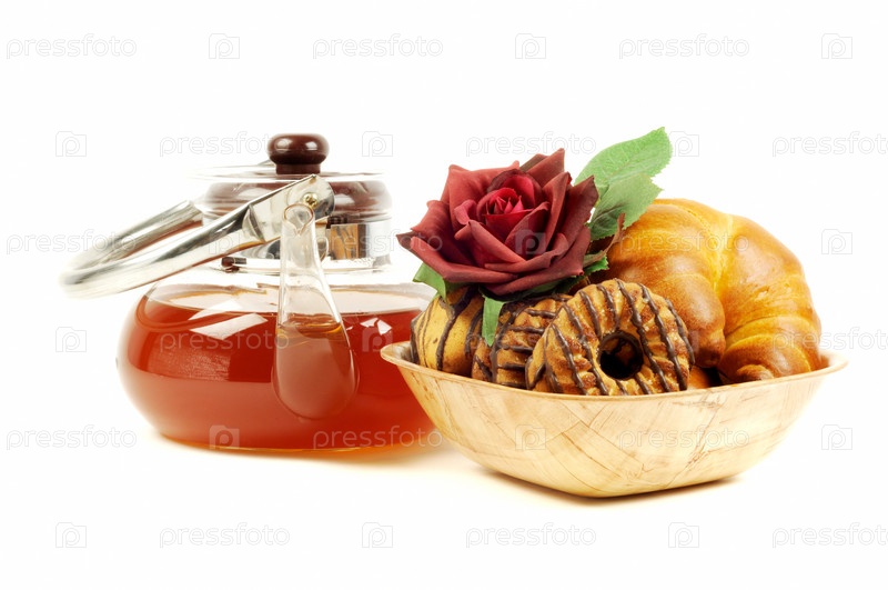 Свежие круассаны и печенье с чайником черного чая на белом фоне