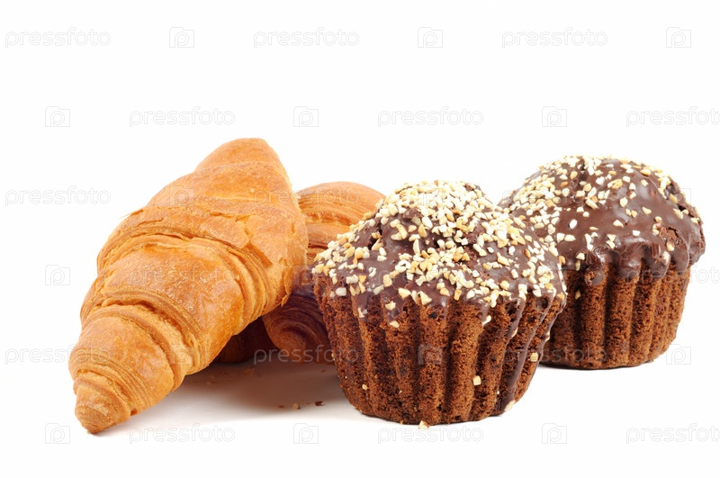 Шоколадные маффины с орехами и круассаны на белом фоне
