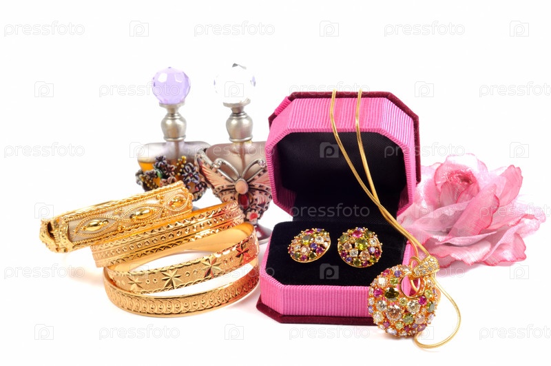 Золотые украшения и флаконы с парфюмом на белом фоне