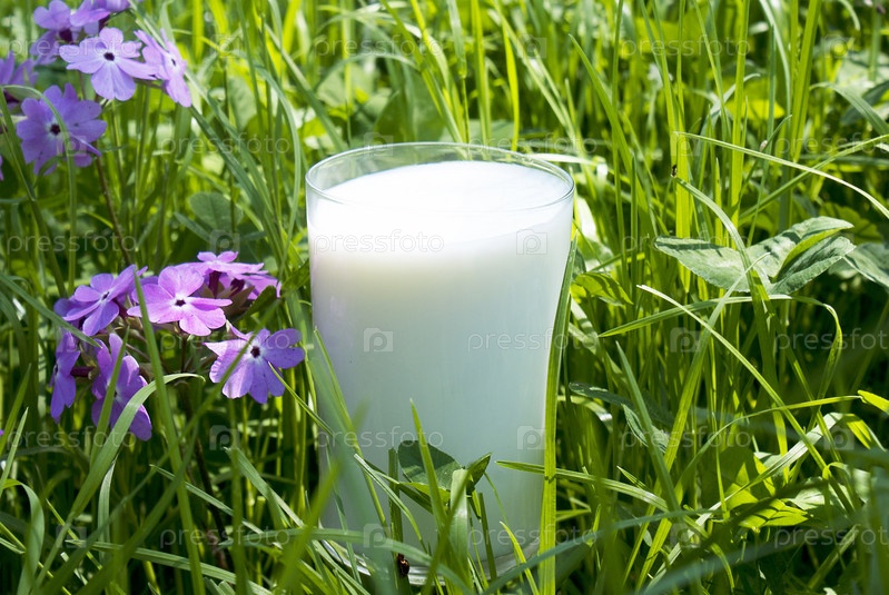 Стакан парного молока на фоне сочной зеленой травы с цветами