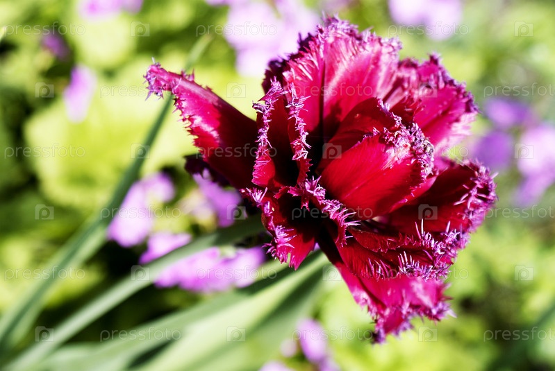 Декоративный красный тюльпан на фоне цветочной клумбы