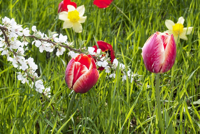 Весенние тюльпаны на фоне зеленой травы