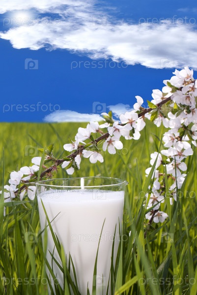 Стакан парного молока на фоне сочной зеленой травы