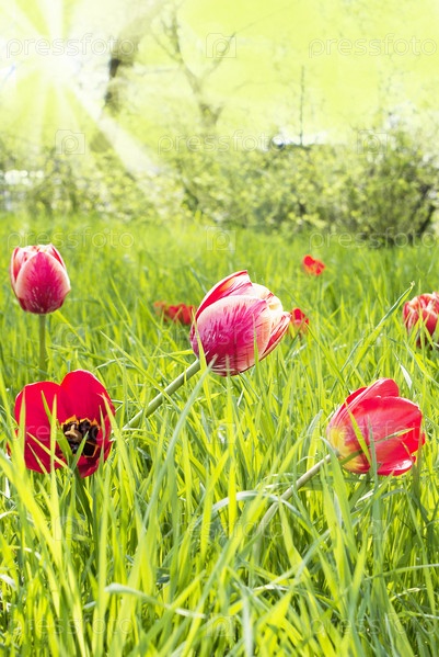 Красные тюльпаны на садовом участке