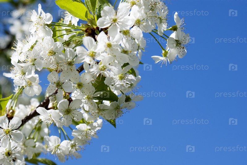Белые цветы вишни на фоне голубого неба