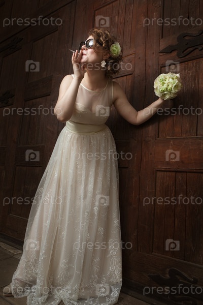 Невеста курит сигарету возле коричневой деревянной двери