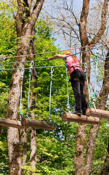 Человек на аттракционе по преодолению препятствий в лесу