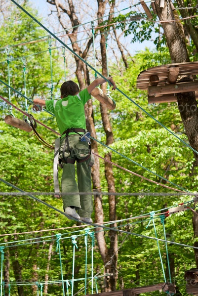 Мальчик на аттракционе по преодолению препятствий в лесу