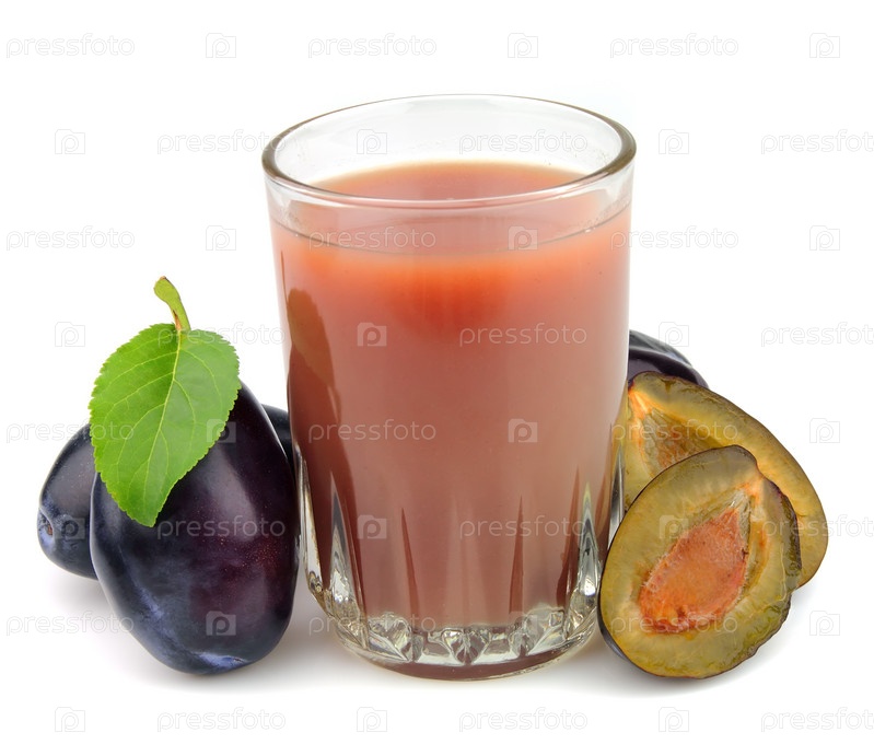 Свежие сливы и полный бокал сливового сока на белом фоне