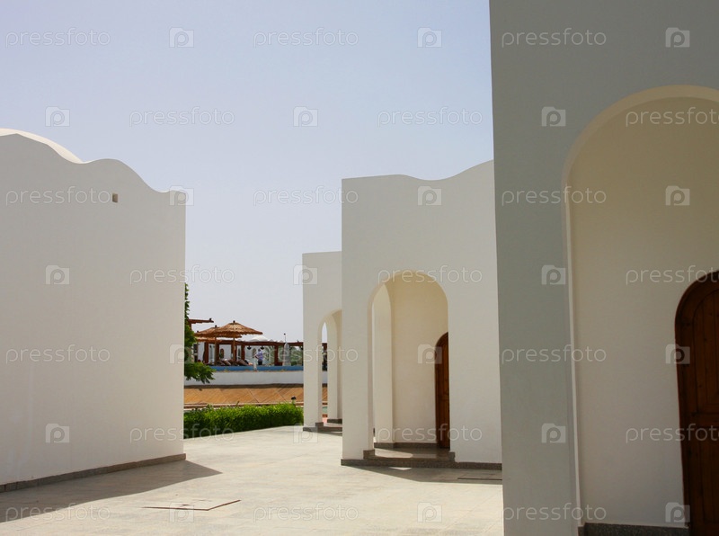 Белое каменное здание с арками и коричневыми дверями, обращенными друг к другу