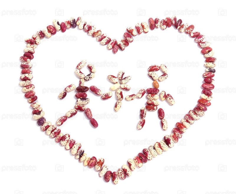 Девочка и мальчик в сердце, выложенные красной фасолью, на белом фоне