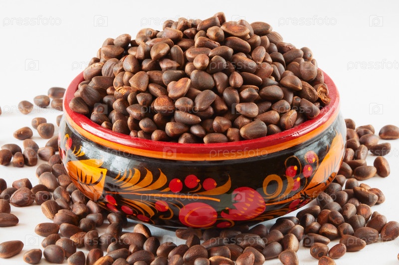 Чашка с хохломской росписью наполнена кедровыми орехами