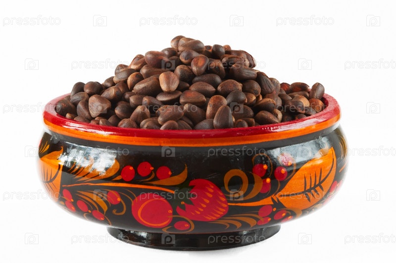 Чашка с хохломской росписью наполнена кедровыми орехами