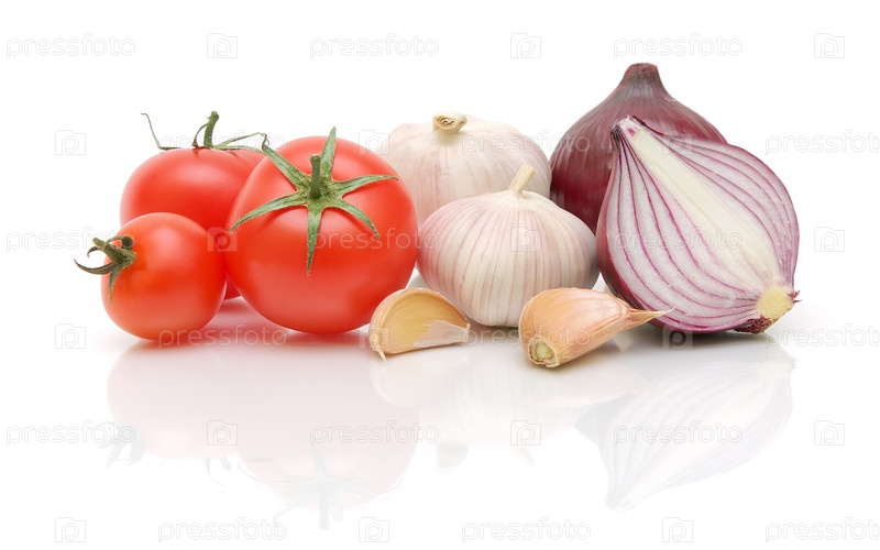Помидоры, чеснок и лук на белом фоне