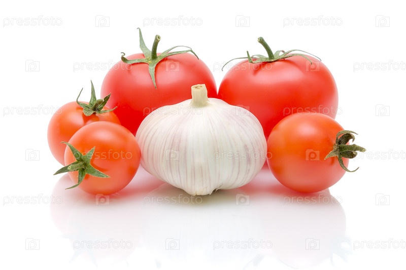 Помидоры и чеснок на белом фоне