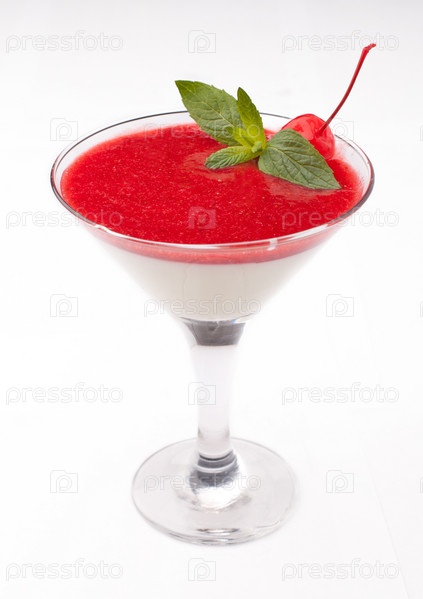 Десерт с вишней и клубничным джемом на белом фоне