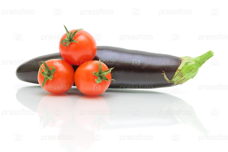 Баклажан и три помидора черри на белом фоне