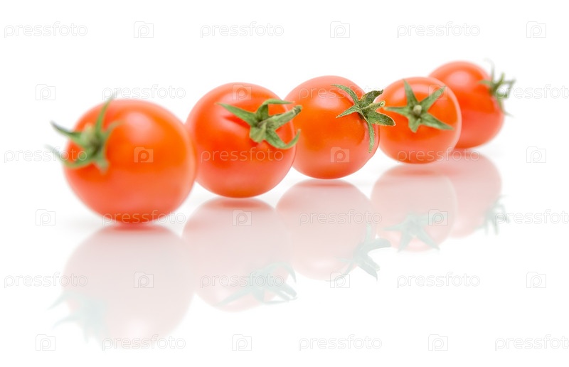 Пять спелых томатов на белом фоне с отражением
