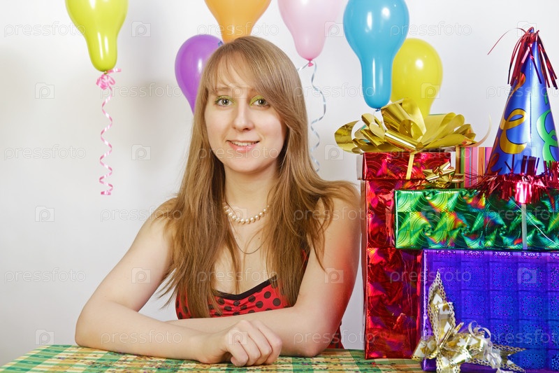 День рождения. Девушка с подарками и воздушными шарами