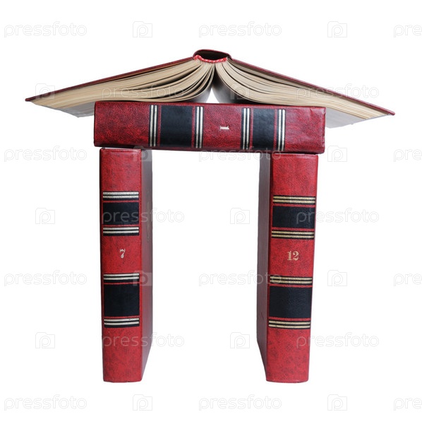 Дом из книг в красном переплете на белом фоне