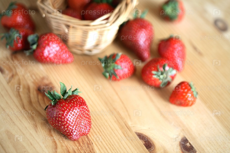 Свежая клубника в плетеной корзине на деревянном столе