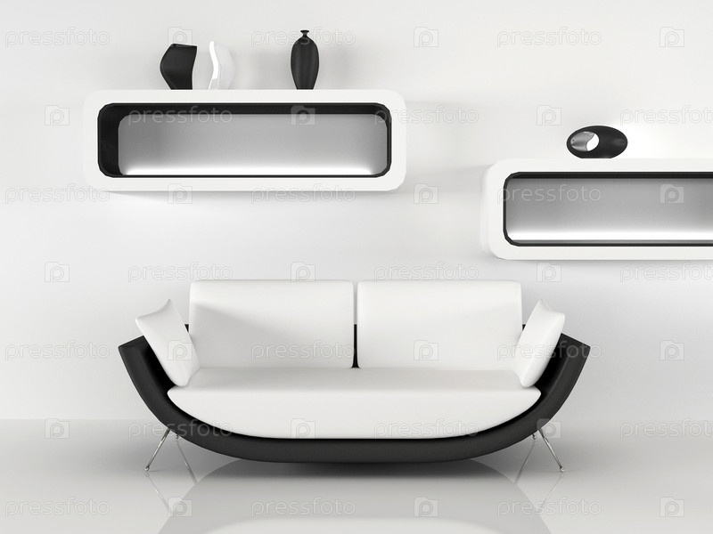 Современный белый диван и полки, минимализм в интерьере