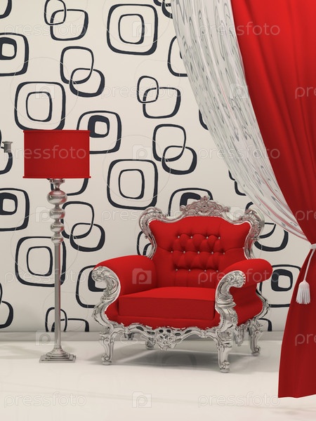Роскошное кресло с торшером на фоне абстрактных обоев