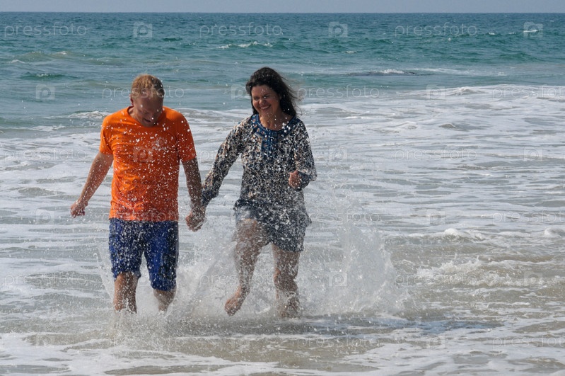 Влюбленная пара бежит на берегу моря