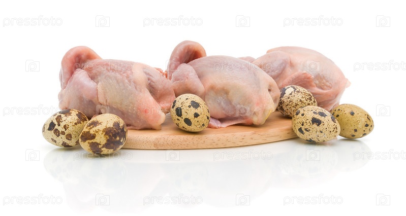 Свежие тушки перепелов и перепелиные яйца на белом фоне