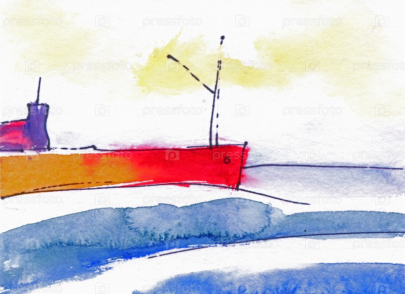 Рыболовецкий сейнер. Акварельная открытка