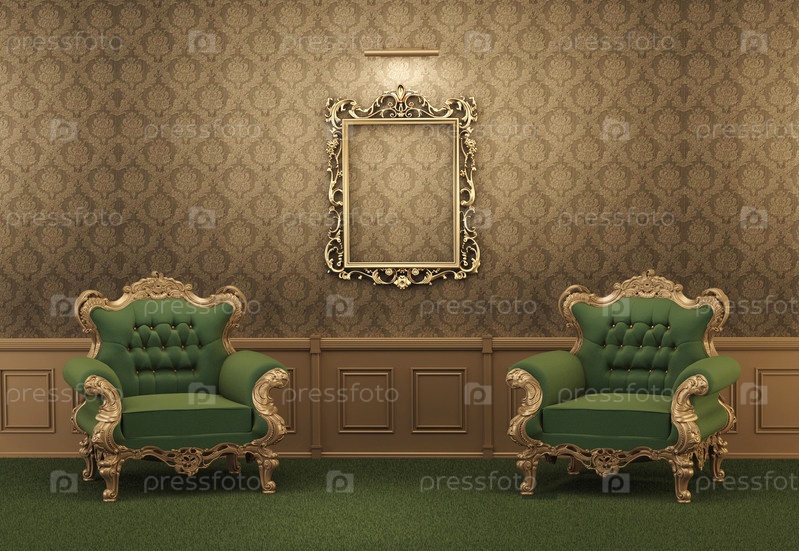 Кресла и пустые рам ы на стенах в роскошном интерьере