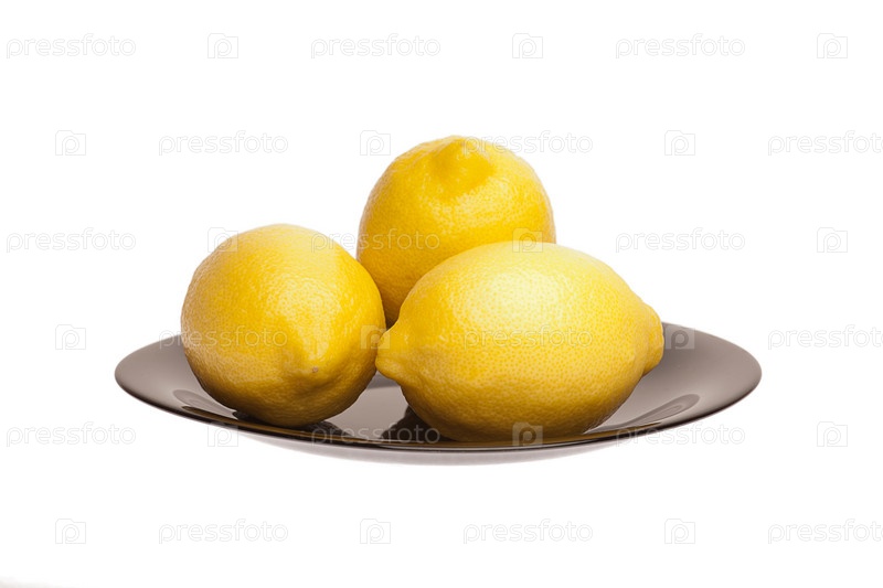 Три лимона на тарелке, белый фон