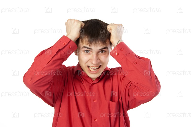 Парень в красной рубашке рвет волосы на голове