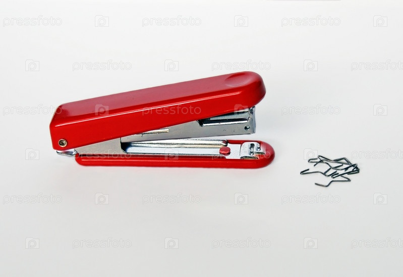 Красный степлер со сломанными скобки на белом фоне